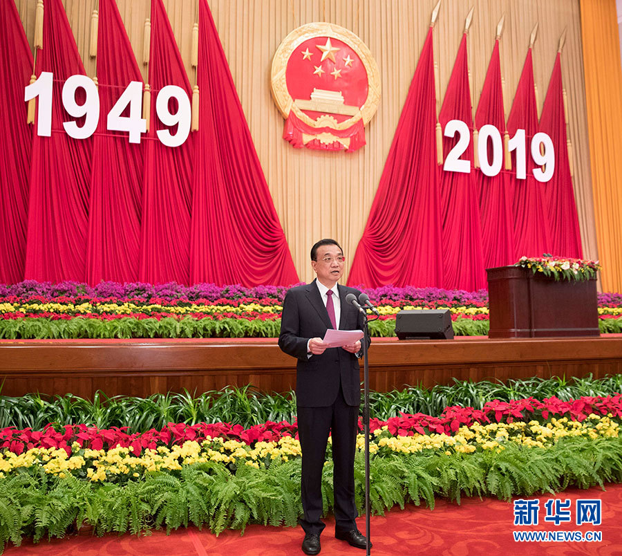 李克強(qiáng)主持 栗戰(zhàn)書汪洋王滬寧趙樂際韓正王岐山出席 ---慶祝中華人民共和國成立70周年招待會30日晚在人民大會堂隆重舉行。" />