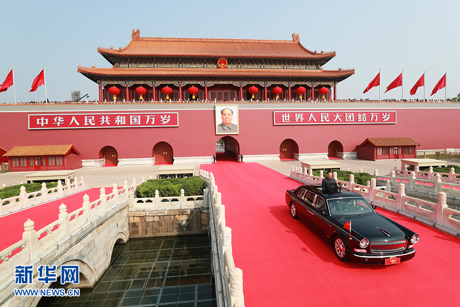 這是習近平乘坐檢閱車,經過金水橋,駛上長安街。 新華社記者 龐興雷 攝