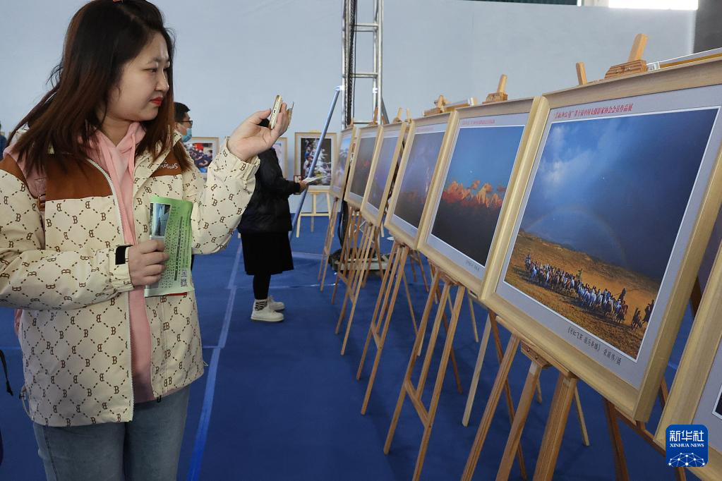 4月23日,一名观众在展览现场上拍摄展出的摄影作品。