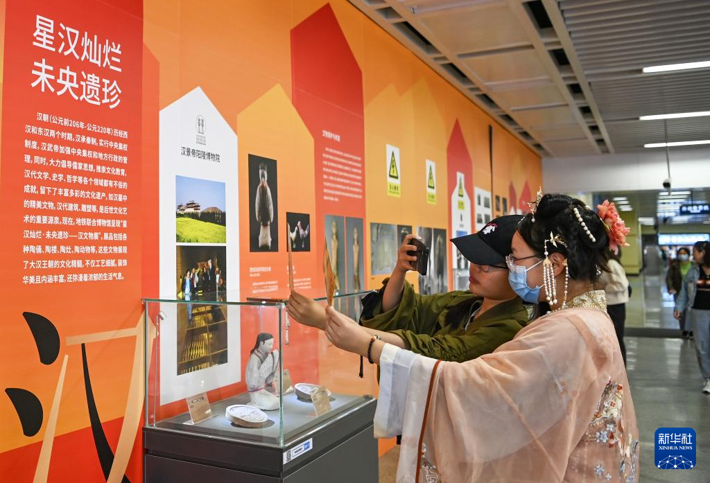 游客在西安地铁大雁塔站“星汉灿烂·未央遗珍——汉”主题展览上打卡留念(5月27日摄)。