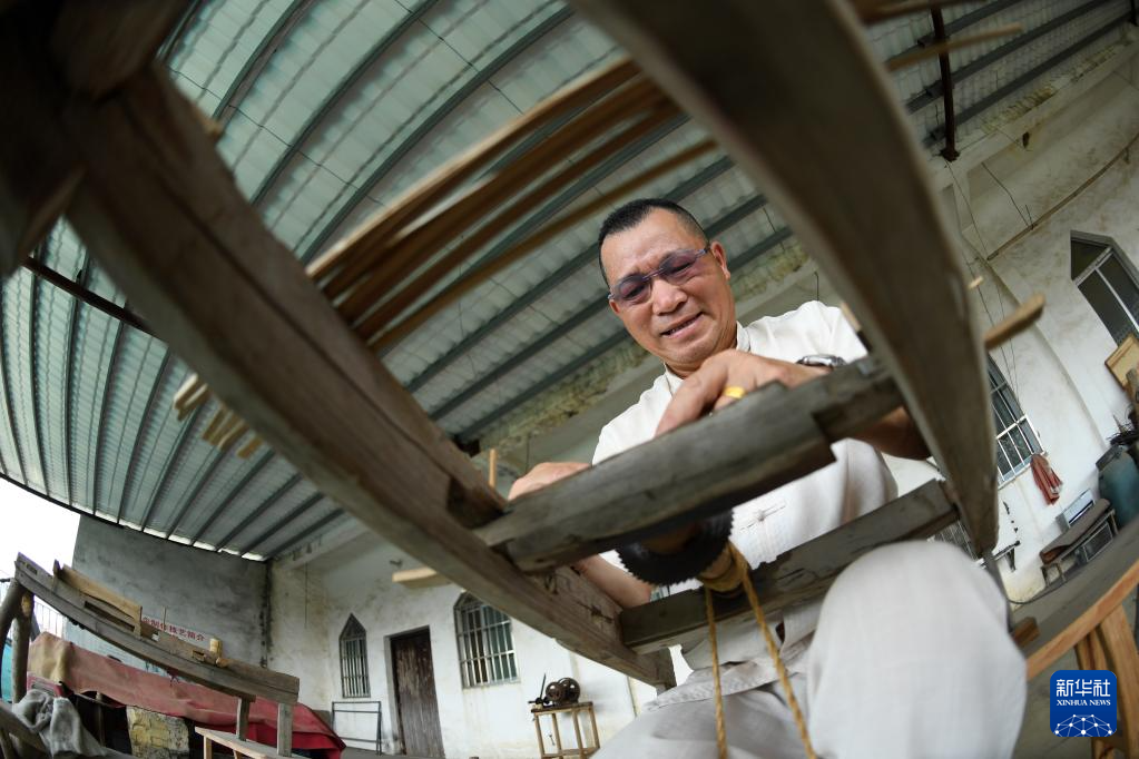 6月1日,在广西宾阳县宾州镇陆村,陆云岗在制作油纸伞。