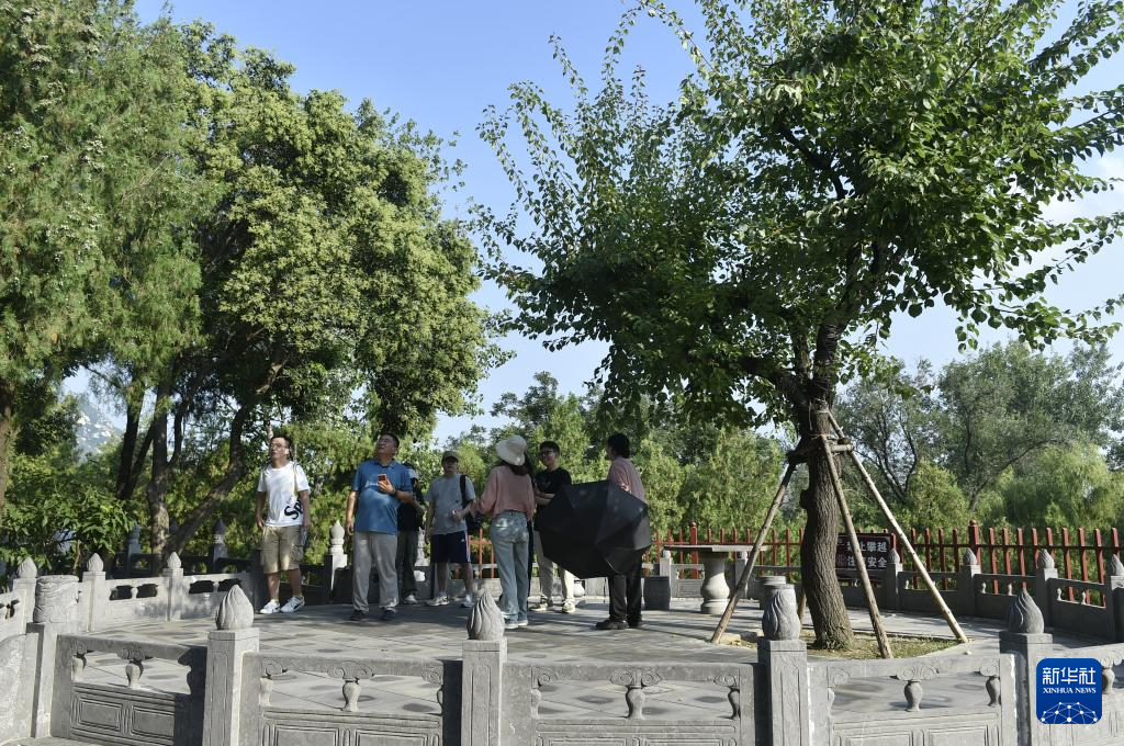 8月7日,游人在嵩阳书院内的“杏坛”参观。