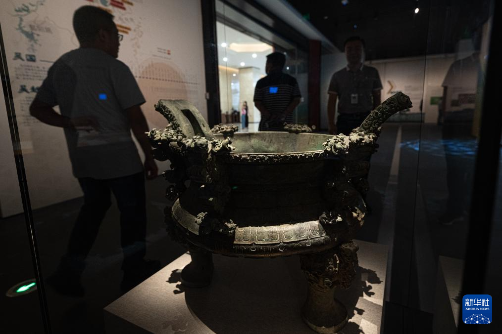 9月23日,参观者在湖北省博物馆长江文明特展上观看展出的束腰鳞纹铜升鼎。