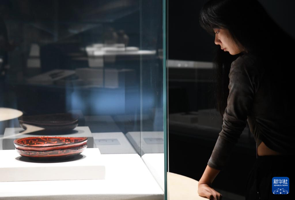 10月25日,观众在秦始皇帝陵博物院观看荆州博物馆馆藏文物鸟纹漆盂。