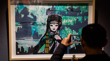 1月3日,在位于山东省巨野县的巨野县书画院工笔画绘制室,绘画师樊玉梅展示自己的作品。