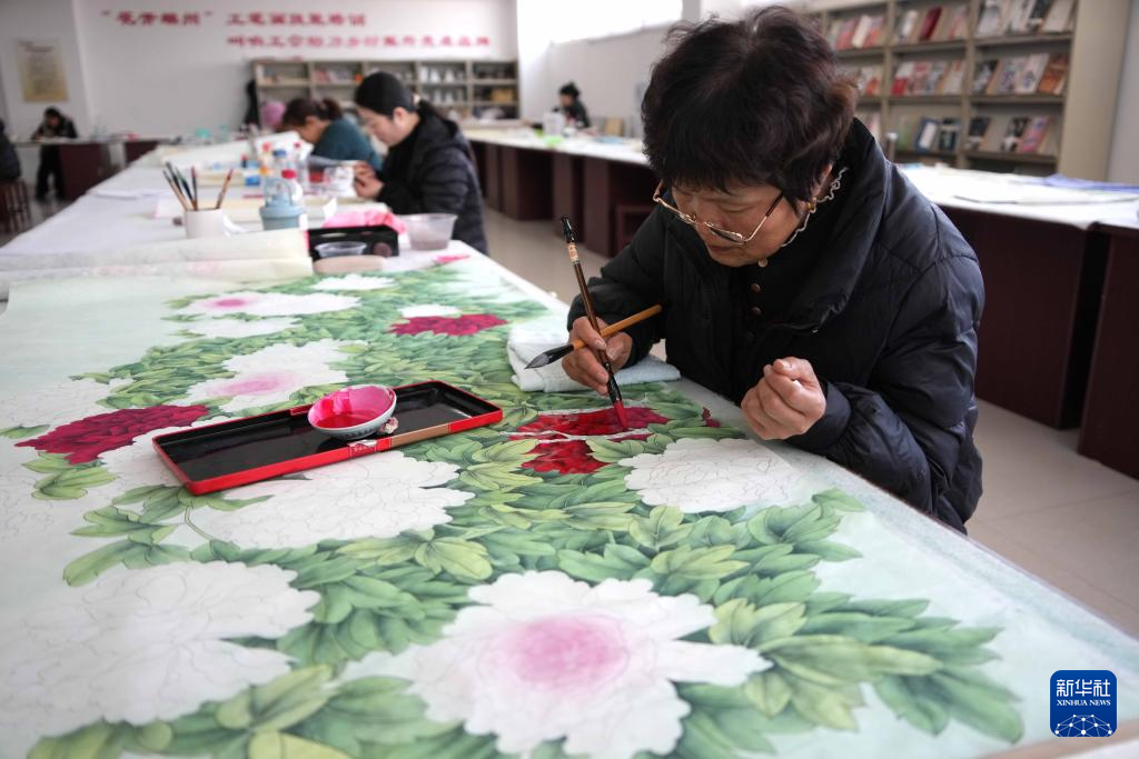 近日,山东省巨野县的工笔画绘画师忙着绘制以牡丹画为代表的工笔画作品,供应春节节前文化消费市场。近年来,山东省巨野县大力发展工笔画产业,全县有绘画专业镇4个、绘画专业村50个,书画产业从业人员2万余人,年创作工笔画作品超过100万件,作品远销40多个国家和地区。