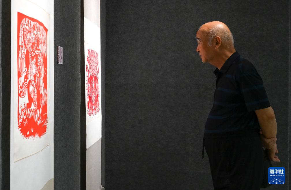 6月20日,参观者在呼和浩特职业学院美术馆观赏剪纸作品。