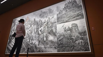 8月25日,参观者在中国美术馆观看展出作品《百团大战》。