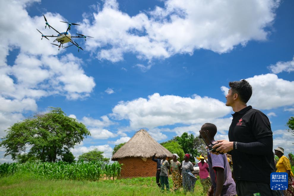 1月26日,在津巴布韦中马绍纳兰省沙姆瓦地区津迪村,中国援津第四期高级农业专家组专家马登荣(前右)为村民示范农用无人机喷洒农药。新华社记者 杨光 摄