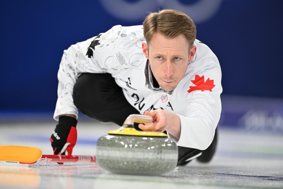 2月15日,加拿大队选手肯尼迪在比赛中。当地时间15日,在意大利科尔蒂纳举行的米兰-科尔蒂纳冬奥会冰壶男子循环赛中,中国队3:6不敌加拿大队。新华社记者 连漪 摄