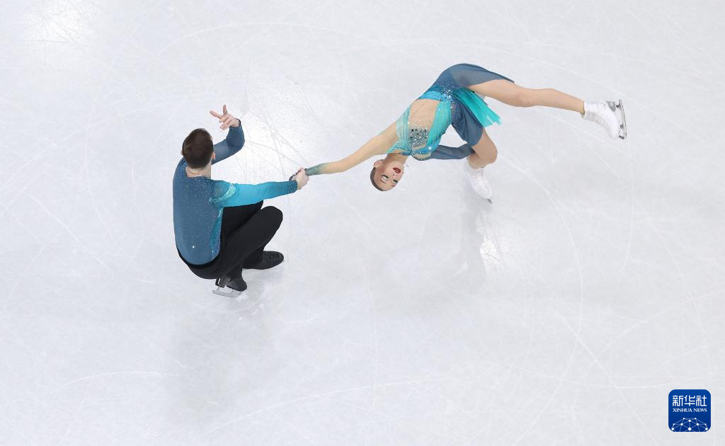 2月16日,格鲁吉亚组合梅特尔基娜/别鲁拉瓦(左)在比赛中。他们获得双人滑项目亚军。