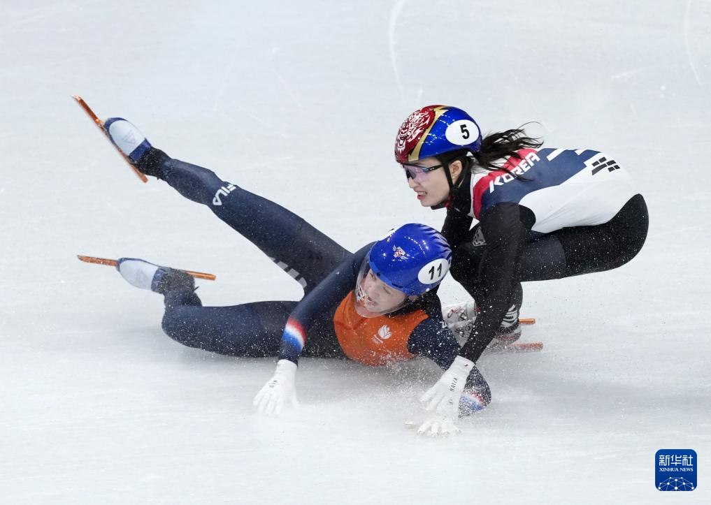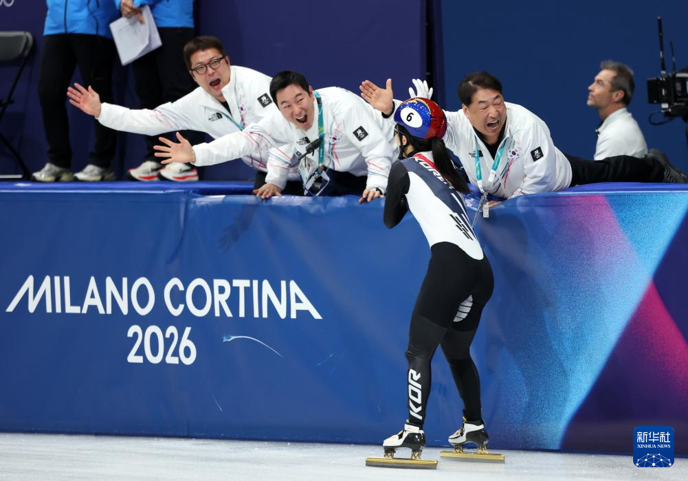 2月18日,韩国队选手金吉莉(左)在比赛中率先冲线后庆祝。