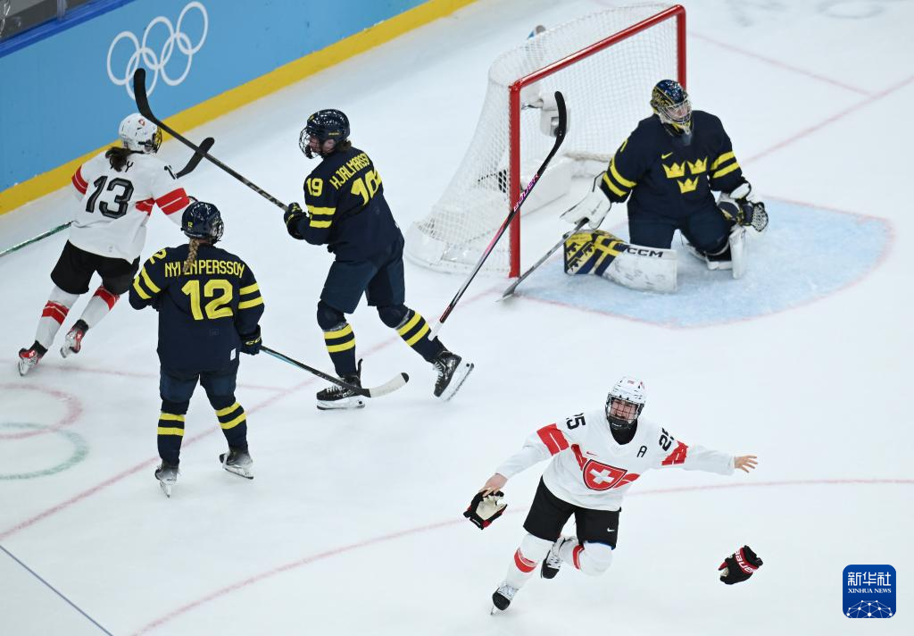 2月19日,瑞典队球员在比赛中庆祝进球。