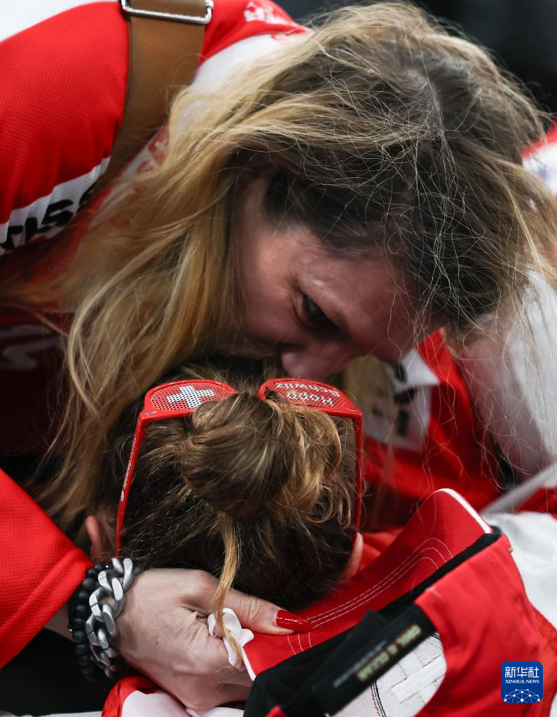 2月19日,瑞士队选手妮科尔·瓦拉里奥(下)在赛后与家人庆祝。