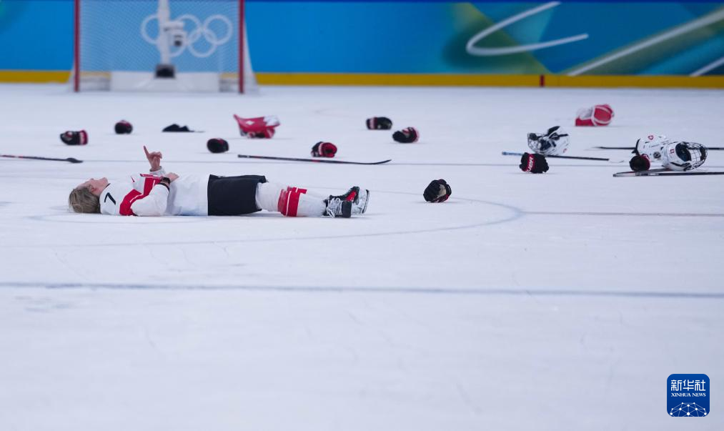 2月19日,瑞士队球员拉拉·斯塔尔德在赛后躺在冰面上庆祝胜利。