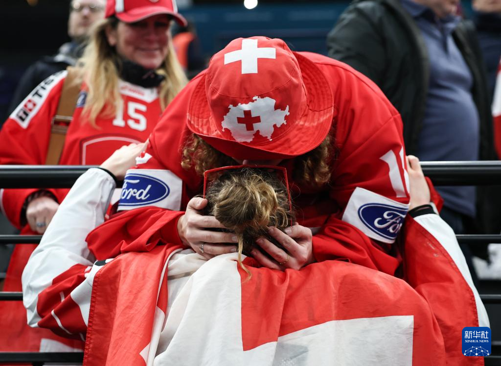 2月19日,瑞士队球员凯内克(下)在赛后与亲友庆祝。