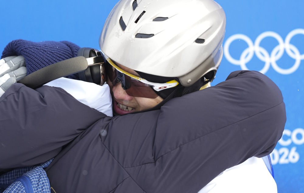 2月20日,王心迪(右)和妻子徐梦桃在比赛中拥抱。新华社记者 邬惠我 摄