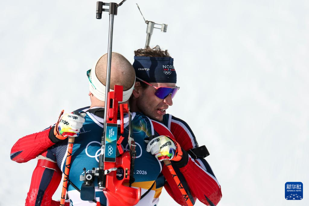2月20日,亚军挪威选手斯图拉·霍尔姆·莱格雷德(左)和季军法国选手康坦·菲永·马耶在赛后拥抱庆祝。