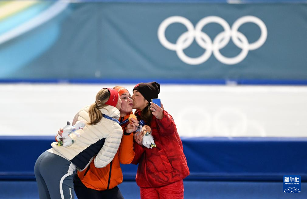 2月20日,冠军荷兰选手赖普马-德容(中)、亚军挪威选手维克隆(左)与季军加拿大选手马尔泰在颁奖仪式上自拍。