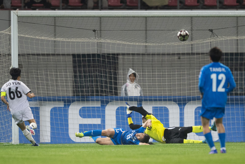 3月29日,韩国水原队球员在进球后庆祝。新华社记者 肖艺九 摄