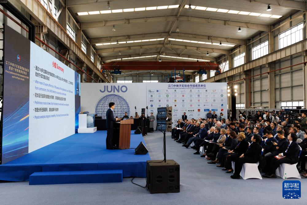 2025年11月19日,在广东省江门市举行的发布会上,中国科学院高能物理研究所副所长、江门中微子实验国际合作组物理分析负责人温良剑在报告首个物理成果。