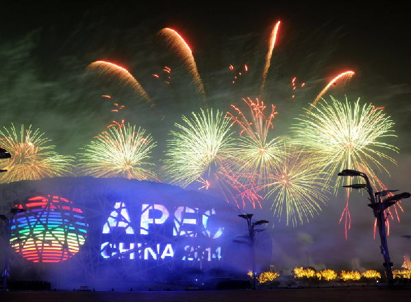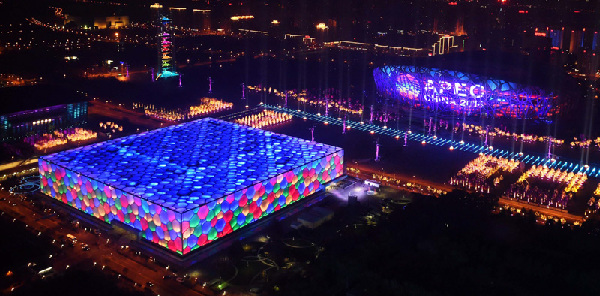 17時40分許,水立方和鳥巢的彩燈已經(jīng)在夜色中閃亮。當晚,國家主席習近平和夫人彭麗媛在北京國家游泳中心(水立方)舉行宴會,歡迎出席APEC會議的各成員經(jīng)濟體領(lǐng)導人或代表及配偶。