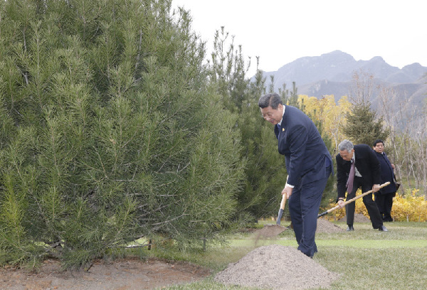 11時40分許,習主席與各成員經(jīng)濟體領(lǐng)導人或代表前往植樹。習主席在開幕辭中希望,亞太經(jīng)濟體以北京雁棲湖為新的起點,引領(lǐng)世界經(jīng)濟的雁陣,飛向更加蔚藍而遼闊的天空。