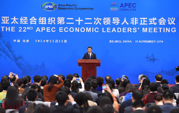 16時許,APEC領(lǐng)導人非正式會議圓滿結(jié)束后,習主席出席記者會并講話。