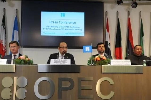 2018年12月7日,在奧地利維也納的石油輸出國(guó)組織(歐佩克)總部,俄羅斯能源部長(zhǎng)諾瓦克、沙特阿拉伯能源、工業(yè)和礦產(chǎn)大臣法利赫、阿拉伯聯(lián)合酋長(zhǎng)國(guó)能源部長(zhǎng)馬茲魯伊與歐佩克秘書長(zhǎng)巴爾金多(從左至右)出席新聞發(fā)布會(huì)。當(dāng)日,石油輸出國(guó)組織(歐佩克)與非歐佩克產(chǎn)油國(guó)達(dá)成協(xié)議,決定從2019年1月開始日均減產(chǎn)原油120萬桶,初步設(shè)定期限為6個(gè)月。 新華社記者 劉向 攝