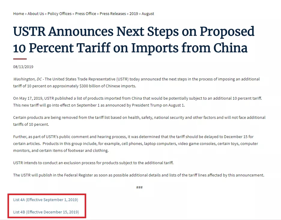 當(dāng)?shù)貢r間8月13日,美國貿(mào)易代表辦公室(USTR)官網(wǎng)掛出聲明,公布了接下來對中國輸美產(chǎn)品加征關(guān)稅的相關(guān)計劃。與此前美方聲稱的9月1日生效日期不同的是,部分對華關(guān)稅的生效將推遲到12月15日。