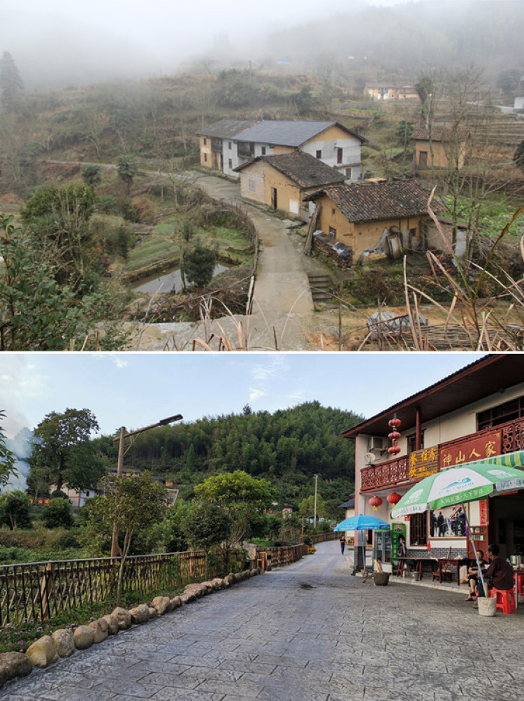 上圖:脫貧前的井岡山市神山村一角。攝于2016年1月;下圖:現在的井岡山市神山村一角。攝于2019年9月。(新華社發(fā))