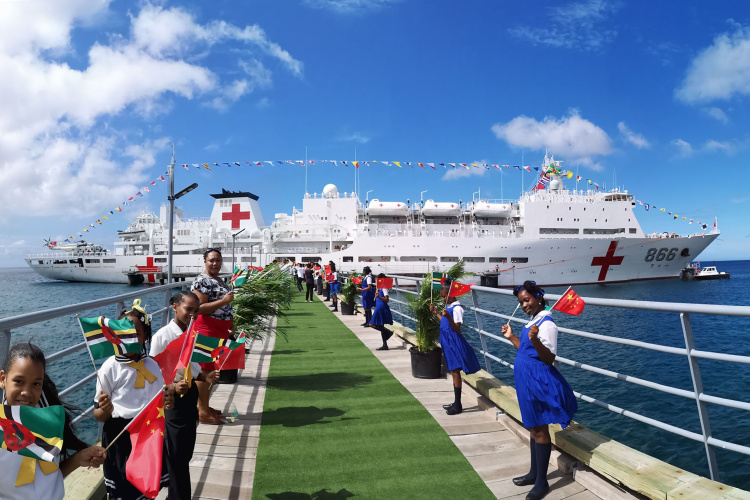 2018年10月12日,在多米尼克首都羅索,當地學生揮動多中兩國國旗歡迎中國海軍和平方舟醫(yī)院船首次到訪。(新華社發(fā))