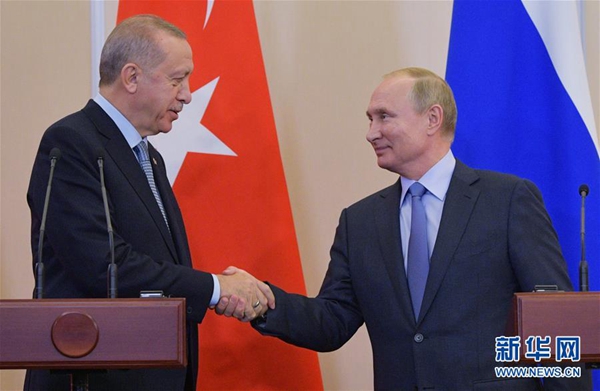 10月22日,在俄羅斯索契,俄羅斯總統(tǒng)普京(左)與到訪的土耳其總統(tǒng)埃爾多安握手。新華社/衛(wèi)星社