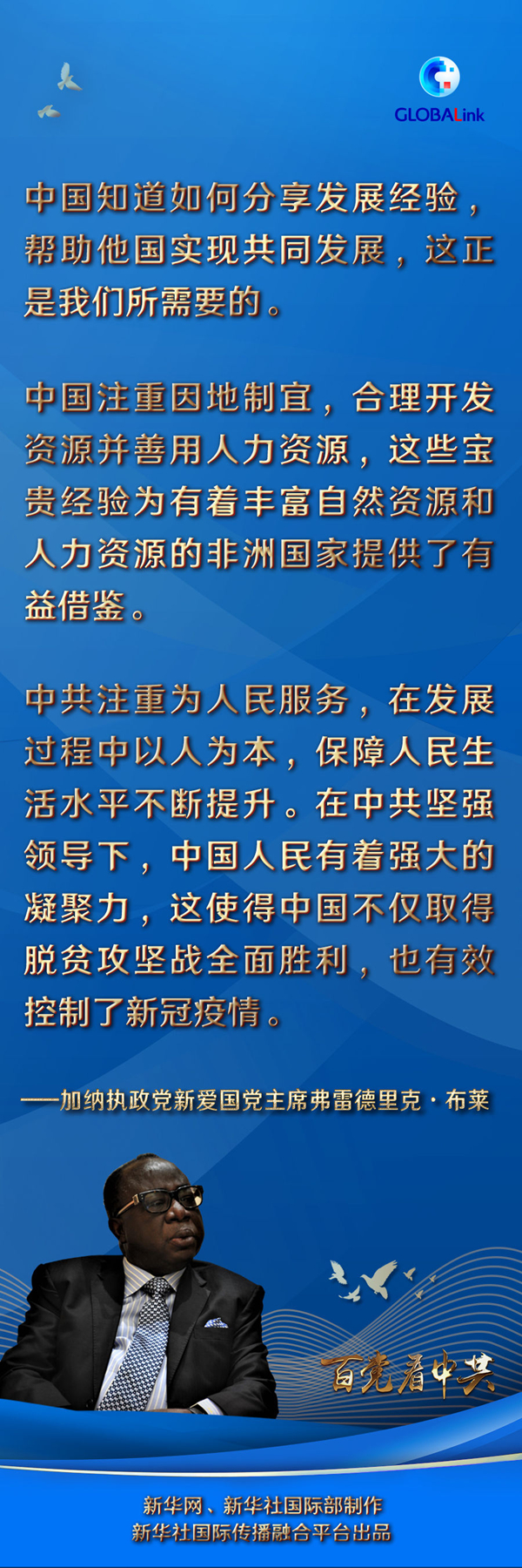 布萊對中國共產(chǎn)黨成立100周年表示祝賀。他祝愿中國在中共領導下取得更多成功,促進世界和平繁榮穩(wěn)定,同時希望加納新愛國黨和中共在未來能有更多交流合作。