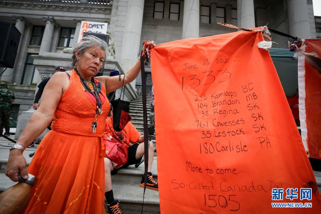 7月1日,原住民社團(tuán)成員在加拿大溫哥華舉行的集會(huì)上展示近期加拿大多地發(fā)現(xiàn)原住民兒童遺骸的清單。